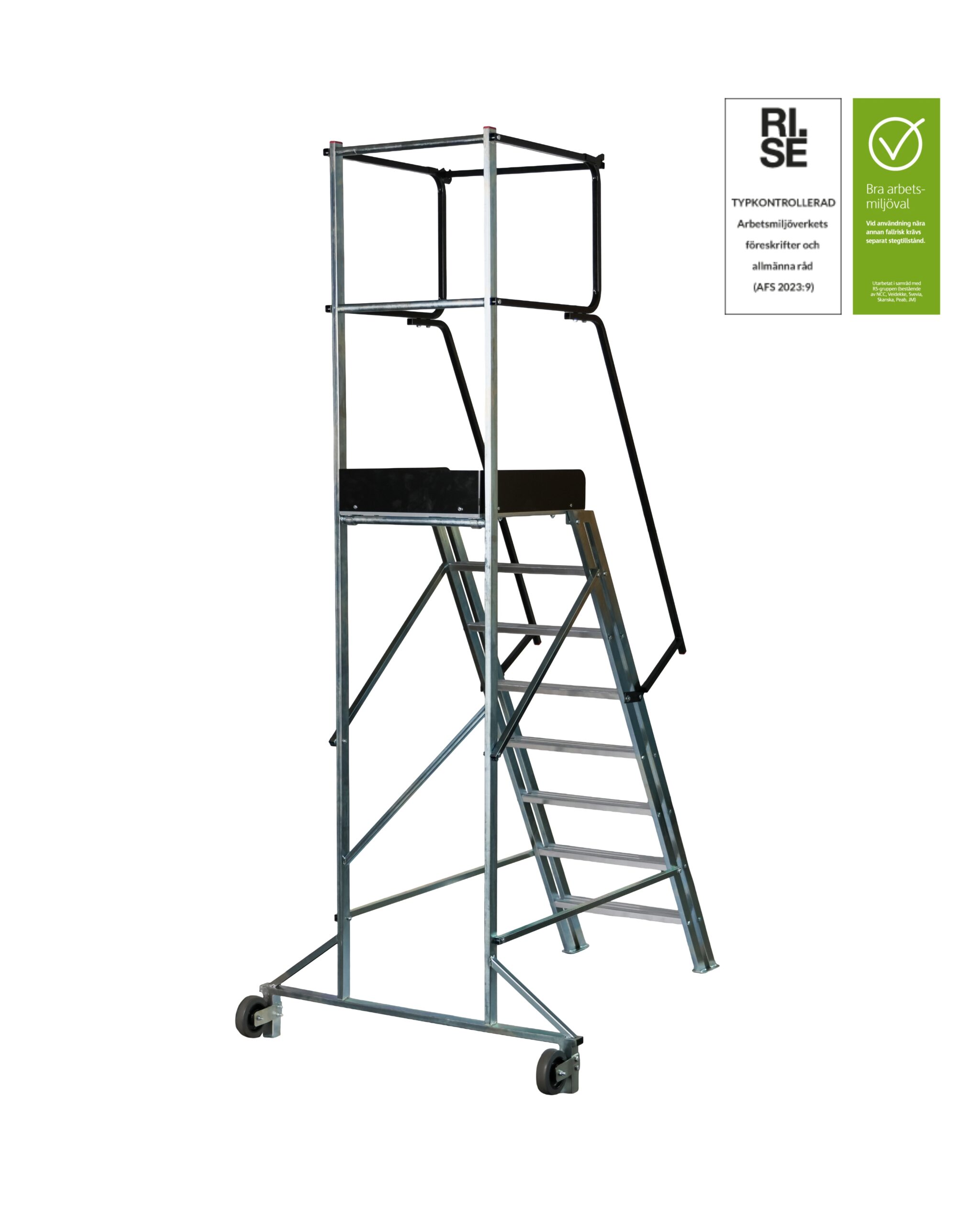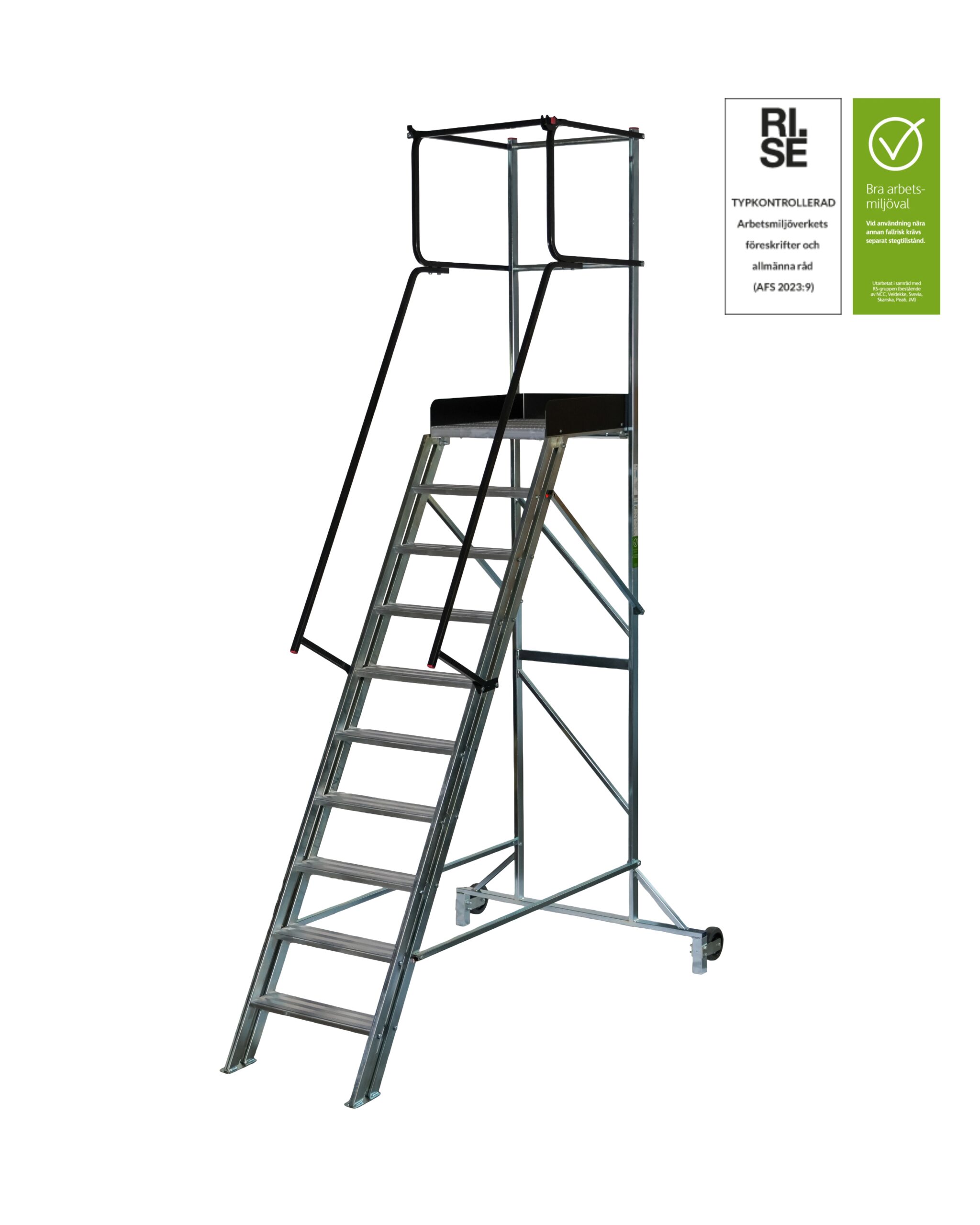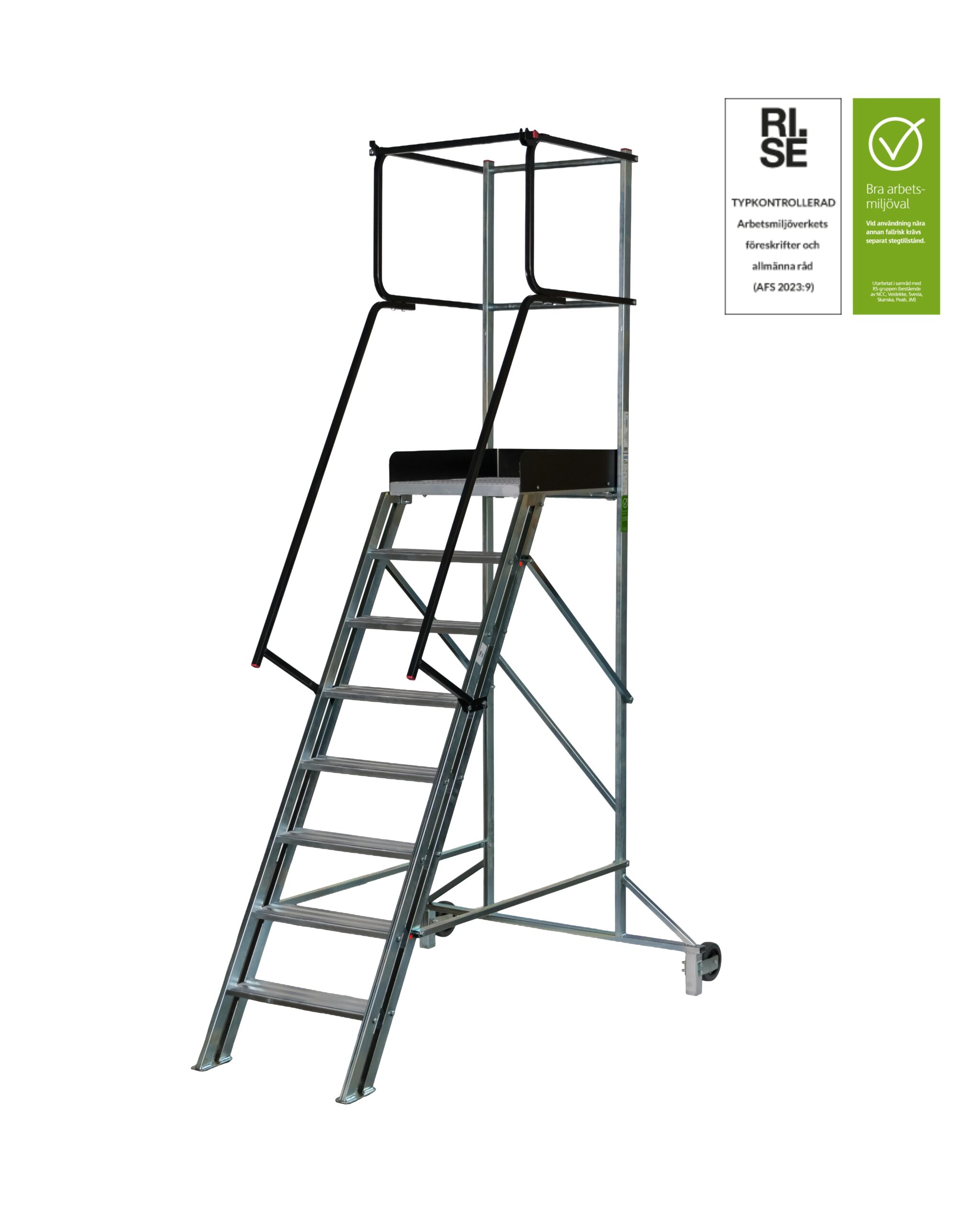 Trappan har ledstänger för att du tryggt ska kunna klättra upp och ned och plattformen har fallskydd på alla fyra sidor. Trappan har 110 mm djupa fotsteg.