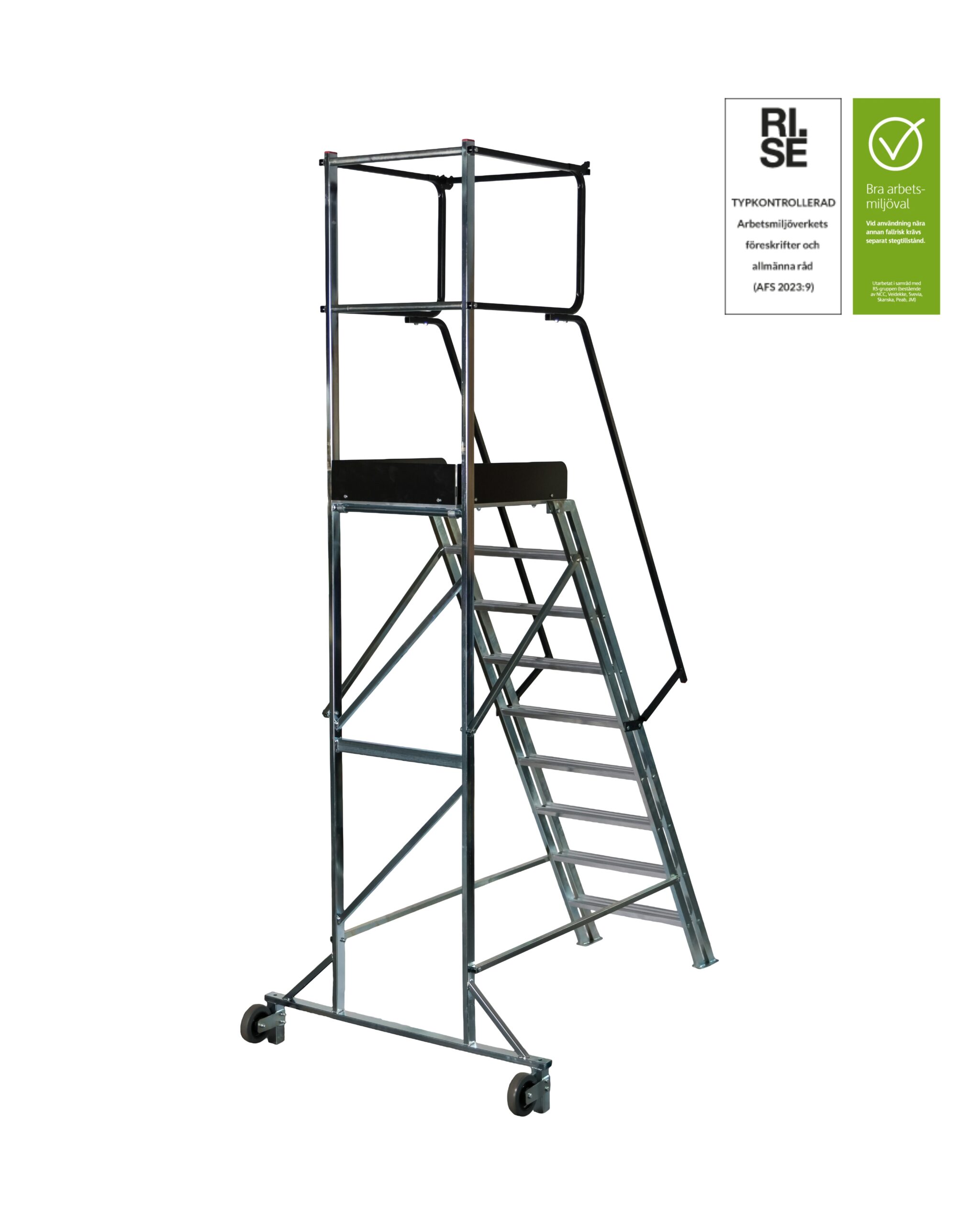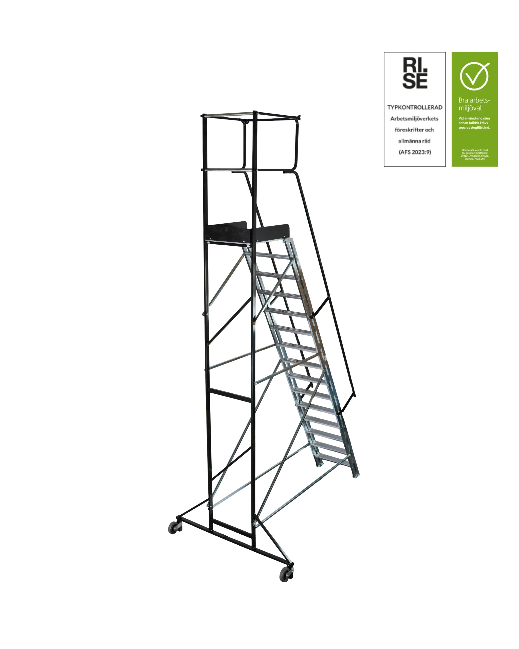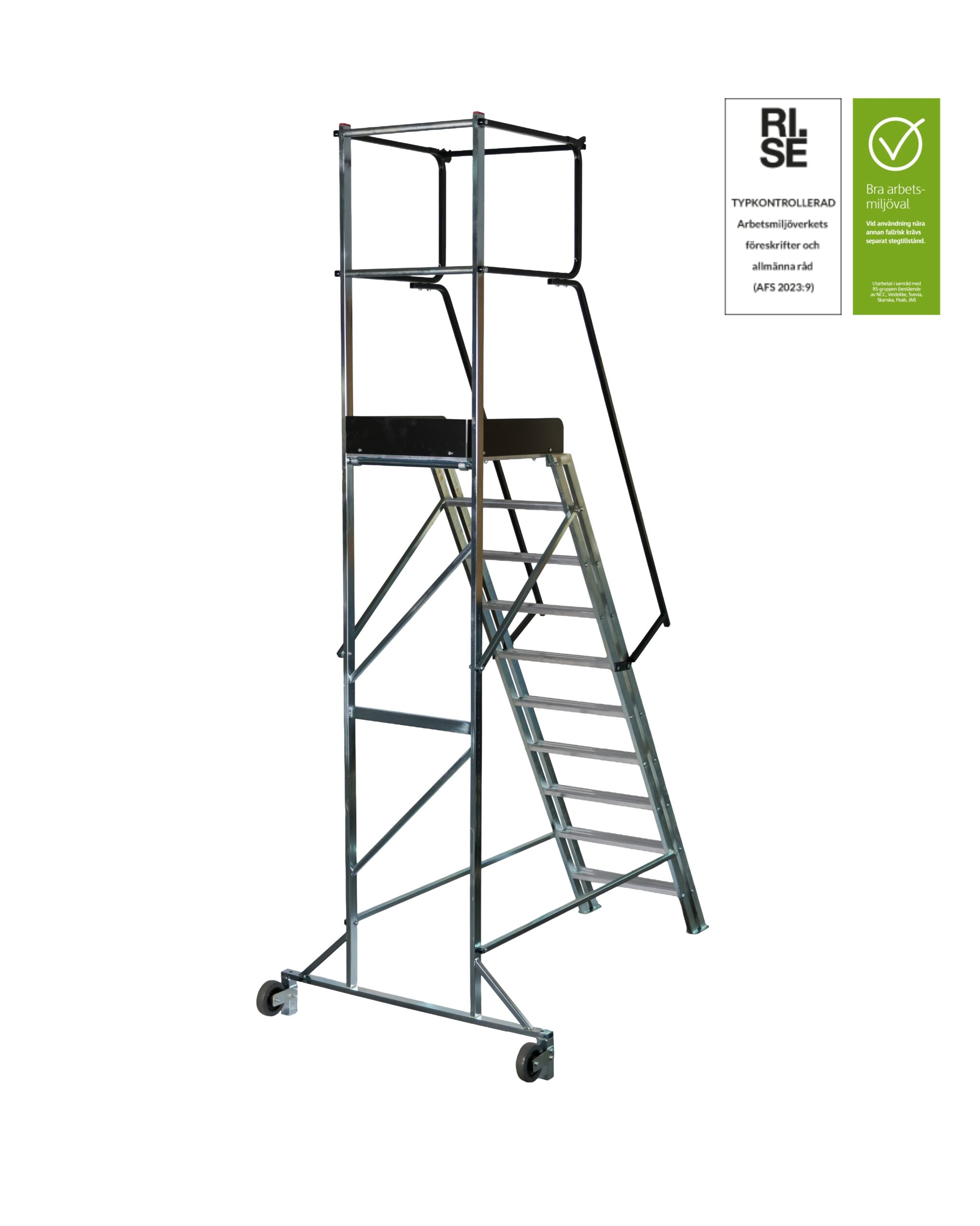 Trappan har ledstänger för att du tryggt ska kunna klättra upp och ned och plattformen har fallskydd på alla fyra sidor. Trappan har 110 mm djupa fotsteg.