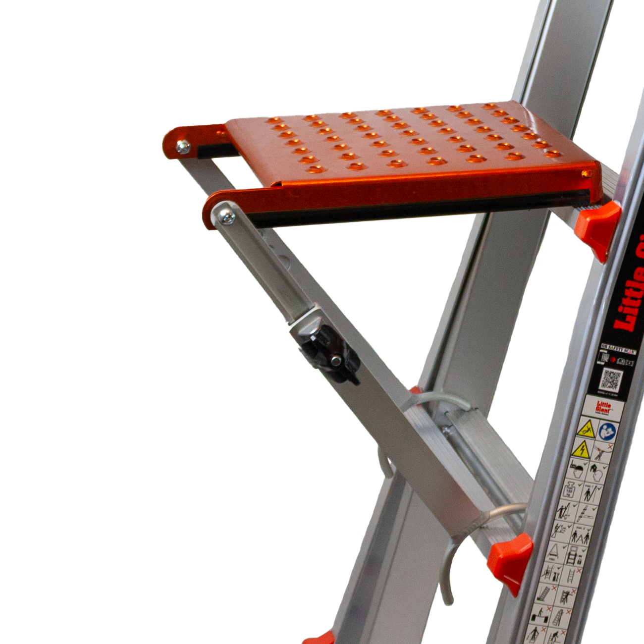 Stabilt och rejält ståplan som enkelt flyttas mellan olika höjder på stegen. Här står du bekvämt och säkert. Ståplanet kan även användas som en praktisk verktygshylla.